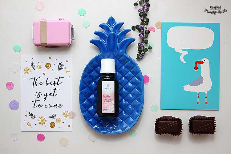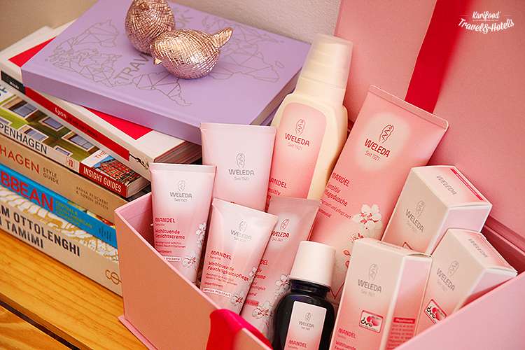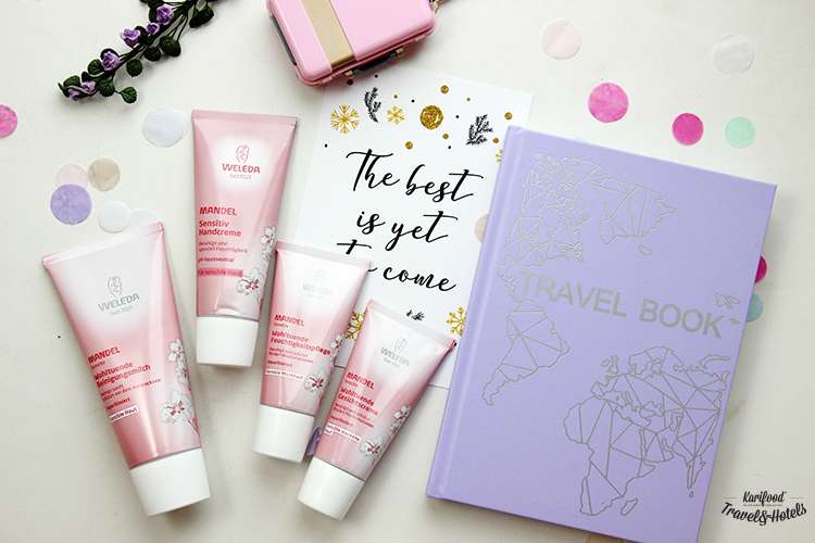 Кажется, я даже поняла общий алгоритм дорожной косметички: 99% того, что укладывается в неё в последний момент, так и вернется домой, ни разу не покинув сумки. Поэтому больше никаких «схватила с полки, бросила в чемодан, вдруг пригодится»! Наш бьюти-багаж рассчитан до миллилитра и сюрпризы в нём практически невозможны. Поэтому, когда ко мне приехала розовая коробка от с миндальной линейкой от Weleda (какой тревел-блогер не мечтал побывать бьюти-блогером ну хотя бы разочек?!), первым делом я проверила объёмы тюбиков — пустят ли с ними на борт в ручной клади. И практически всё содержимое коробки может смело отправляться со мной путешествовать!