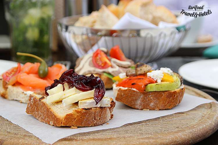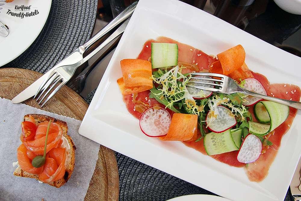 В меню несколько сэндвичей — с овощами гриль, с ростбифом, с морепродуктами, сочное карпаччо из тунца с соевой заправкой, ассорти сыров.