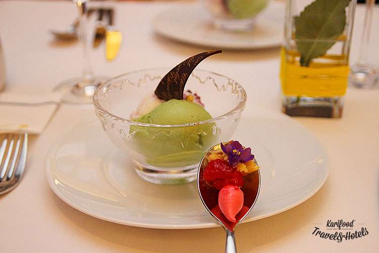 Десертная карта от шеф-кондитера Лео Антониуччи освежает сорбетами и мороженым (обязательно попробуйте несладкий матча), ягодами, меренгами, съедобными цветами.