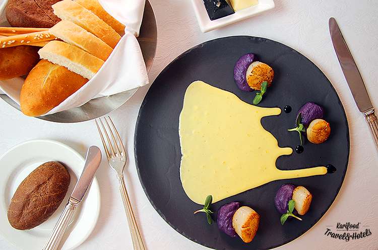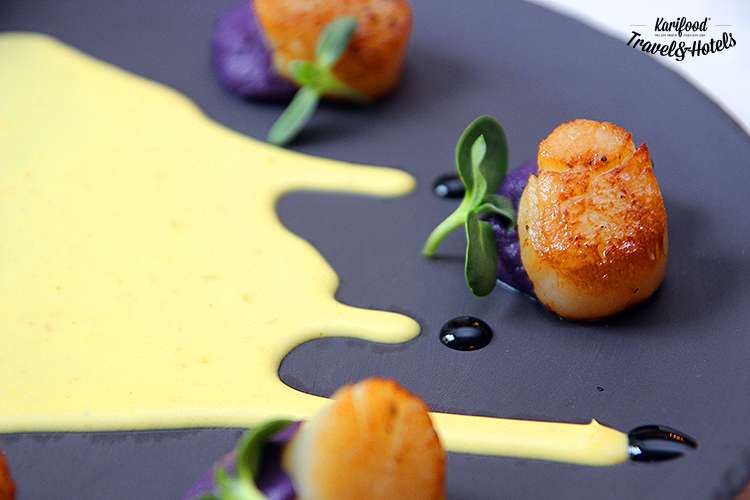 Вся классика в летнем меню Comme il Faut играет яркими красками: например, гребешки подают на лиловом пюре из синей капусты с сочной зеленью маш, с жёлтым шафрановым соусом на чёрной керамической палитре.