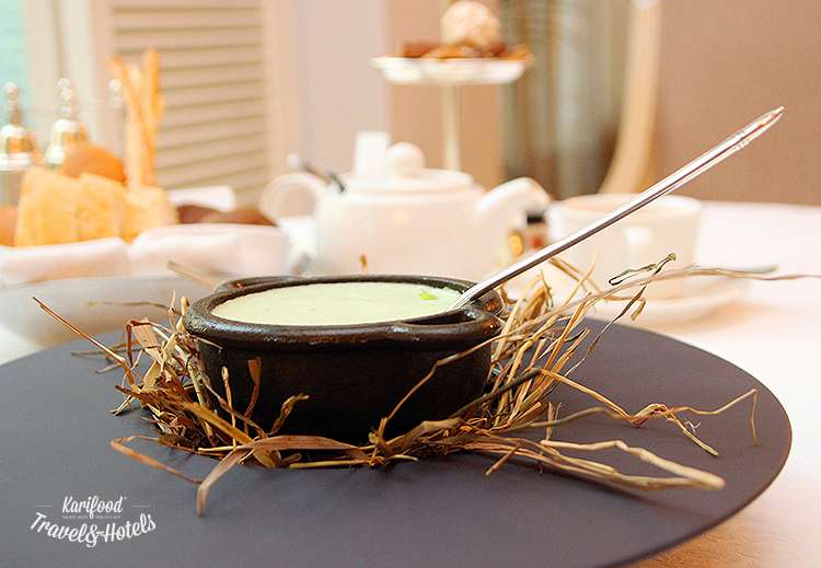 Лёгкий аромат сена, молочная «дымка», похожая на туман над озером, превращают «старый добрый» огуречный суп в кулинарно-художественное произведение.