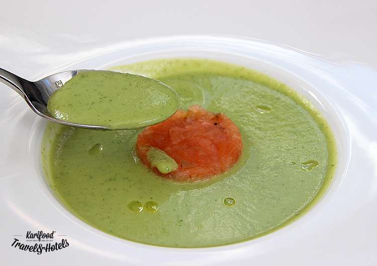 Томатный крем-суп, пряный и концентрированный за счёт того, что томаты для него предварительно запекают, перед подачей заправляют сыром маскарпоне и соусом песто. Лёгкий и свежий зелёный суп из мяты и огурца подают с тартаром из подкопченного лосося.