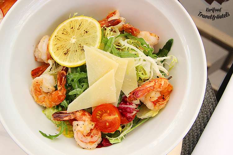 Один из главных фаворитов — салат с креветками, который подают с ломтиками пармезана, сладкими томатами черри и лимонной заправкой.