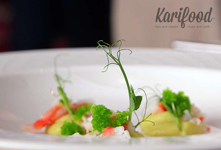 Гаспачо с крабовым мясом, икрой летучей рыбы и микрогрином — одна из самых ярких вкусовых эмоций летнего меню. Выигрышно всё — и подача, и вкус. На дно тарелки выкладывают густой гуакамоле с крабовым мясом, икрой и микрогрином, отдельно приносят графин с перебитыми томатами и острым перцем, и подают порционные мисочки с овощами и зеленью.