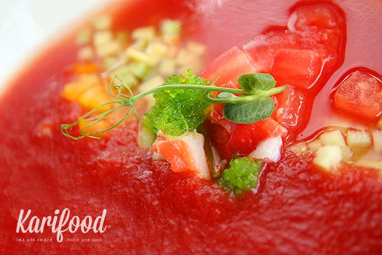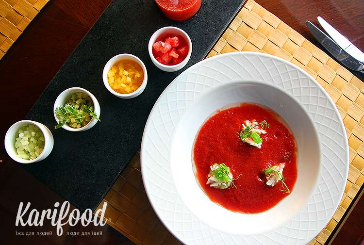 Гость может добавлять дополнительные ингредиенты в суп на свой личный вкус, а то и вовсе обойтись без них. Вовлечение гостя в создание вкусовой композиции, уважение к его выбору плюс контрасты фактур — мягкое мясо камчатского краба, свежая хрустящая зелень, острые чили-перцы, бархатность перетёртых томатов, округлость густого гуакамоле из авокадо — сразу выводят гаспачо в топ летних обновлений.