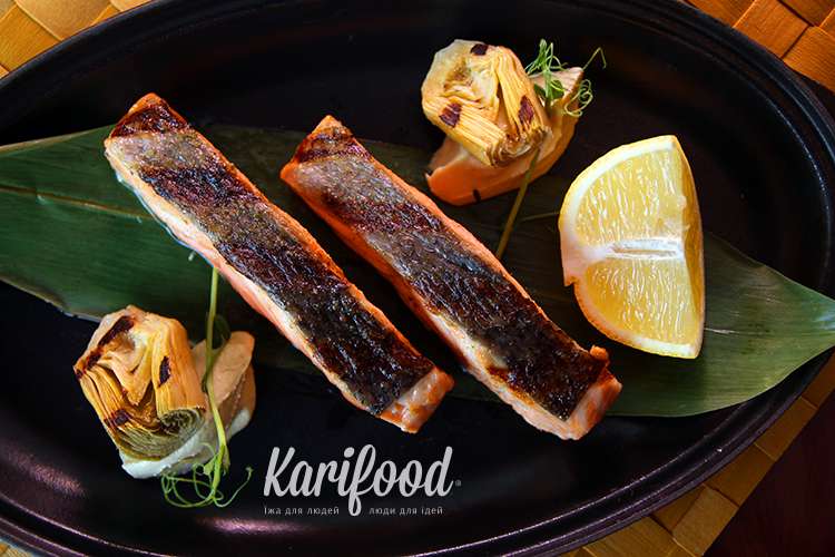 Тяжёлый солёный маринад артишоков тянет одеяло на себя, состязаясь в интенсивности вкуса с рыбой. Немного выручает велюте, который приглушает громоздкость маринада и позволяет лососю заявить о себе, как о главном компоненте, а аромат «дымка» создаёт вокруг блюда ауру надвигающегося отпуска и лета у моря.