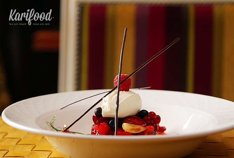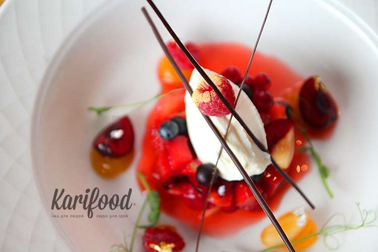 Ягодный тар-тар — одно из самых красивых и богатых блюд всего летнего меню — шоколадные нити, яркие краски ягод на фоне белого сыра, вкрапления пищевого серебра и золота. Однако кислота красных ягод доминирует над всем десертом, с её настойчивостью никак не справляется мягкий крем-сыр.