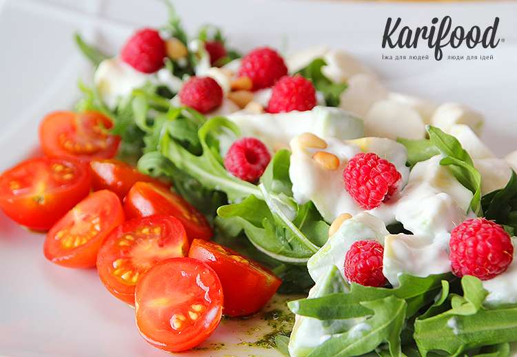 В салате с ягодами основной компонент меняется согласно сезону: заканчивается земляника, её место в салате занимает малина. Салат яркий и сочный, сладкая малина с мягкой нежной бейби-моцареллой, остро-горькой рукколой и чили-кокосовой заправкой составляют цельную и красочную вкусовую палитру.