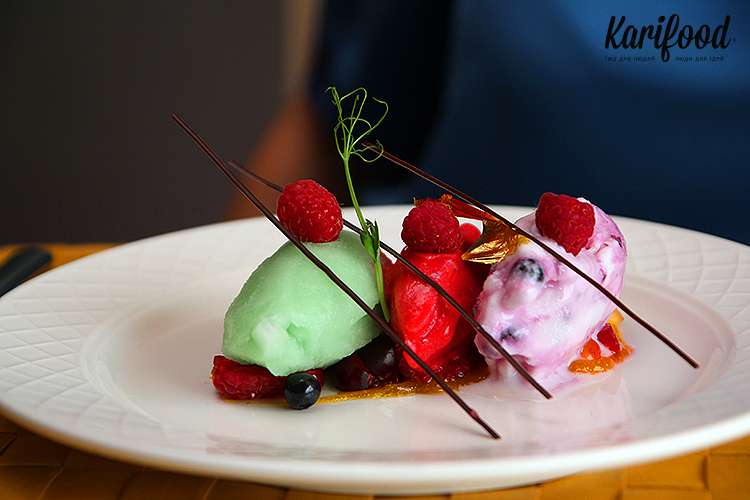Десертные обновления — трио сорбетов и ягодный тар-тар — это тот случай, когда красота важна, но и вкус важен не меньше. Конструкция из трио сорбетов визуально хороша настолько, что сама мысль, чтобы взять десертную ложку в руки и уничтожить творение шеф-кондитера, кажется кощунством. Сочные оттенки и вкусы, хорошо взаимодействующие друг с другом — мята, малина, йогурт, свежие ягоды и нити шоколада. Но в эту идиллию вклинивается замороженная в самих сорбетах черника — вязкая, безвкусная, промороженная.