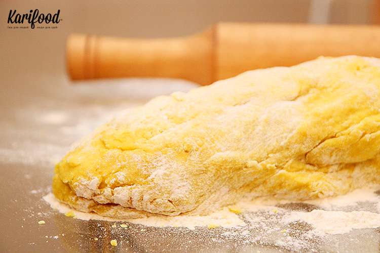Сначала приготовьте тесто. Дважды просейте через сито муку. Добавьте к ней молотую куркуму и размешайте венчиком, чтобы куркума равномерно смешалась с мукой. Растопите сливочное масло на слабом огне. Подогрейте стакан молока и добавьте к нему чайную ложку сухих дрожжей, размешав их до полного растворения в молоке. Влейте в муку молоко с дрожжами, растопленное масло и вбейте два яйца. Замесите тесто и на час оставьте его в тёплом месте.