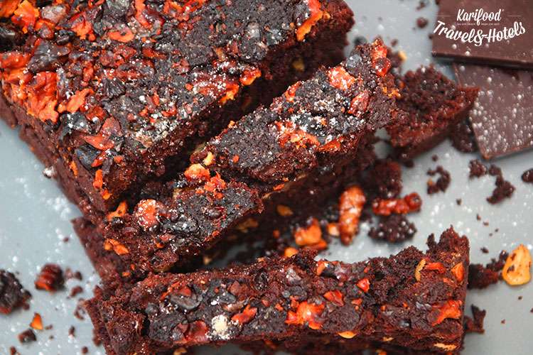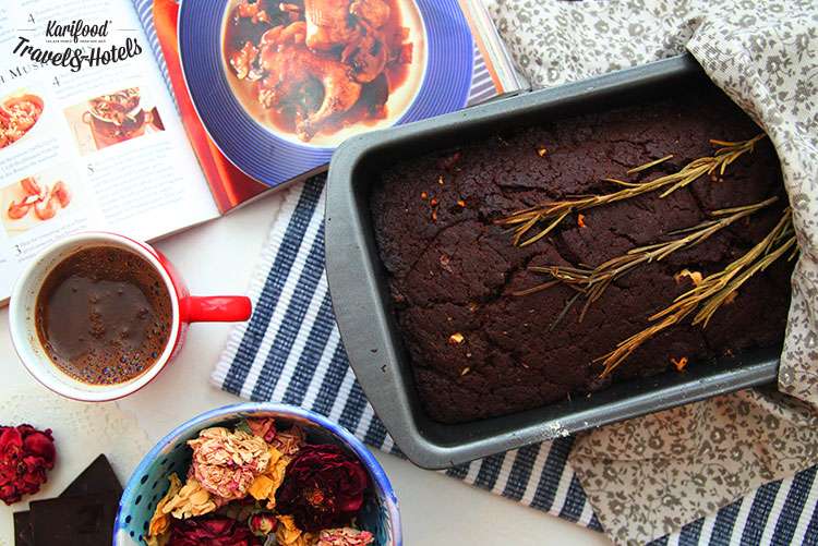Просейте муку, добавьте в неё пряности и какао, тщательно перемешайте венчиком, чтобы смесь получилась однородного цвета. Добавьте соду, погашенную уксусом (или замените на 1 чайную ложку разрыхлителя для теста). В шоколадно-яичную смесь аккуратно и постепенно подмешайте муку, оставшуюся часть орехов и 1 ложку коньяка, замесите тесто. Одно должно получиться гладким, эластичным и чуть вязким. Выложите тесто в форму, украсьте сверху веточками розмарина и выпекайте 50 минут при температуре 220 градусов. После запекания оставьте кейк еще на 10-15 минут отдохнуть в приоткрытой духовке.