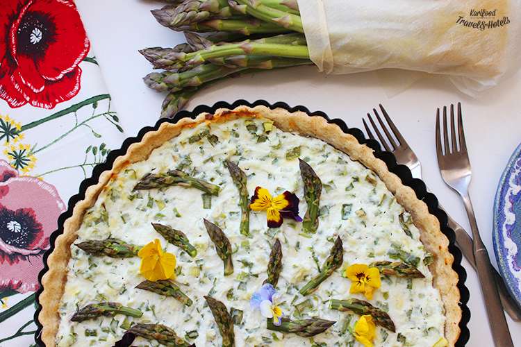 Приготуйте тісто: борошно просійте з тертим мускатним горіхом, влийте в нього олію, почніть вимішувати. Потроху доливайте теплу воду. Тісто має стати еластичним і достатньо м’яким. Тісто розкачайте тонким шаром та викладіть його у форму для випікання, змащену олією. Зверху викладіть начинку та розрівняйте поверхнею, прикрасьте пиріг китицями спаржі.