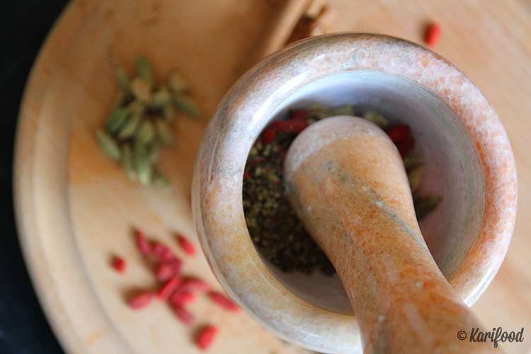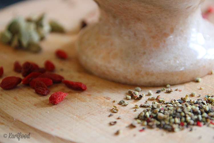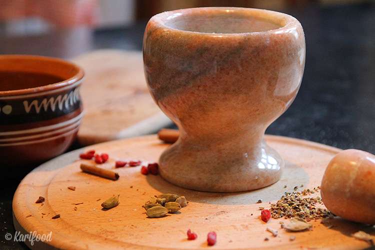 В кофемолке смелите корицу, зерна барбариса и кардамон, оставив 2 цельных кардамоновых зернышка. Специи можно растереть в мраморной ступке. Полученную смесь просейте через маленькое сито.