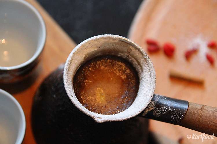 Потребуется: кофе самого мелкого помола для джезвы, 5 зерен кардамона, щепотка молотой корицы, несколько зерен барбариса, чайная ложка сахара.