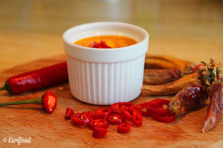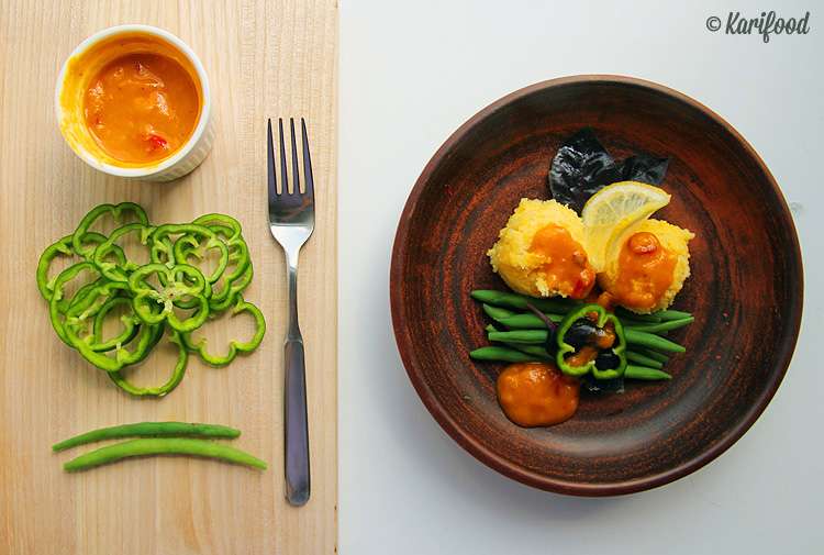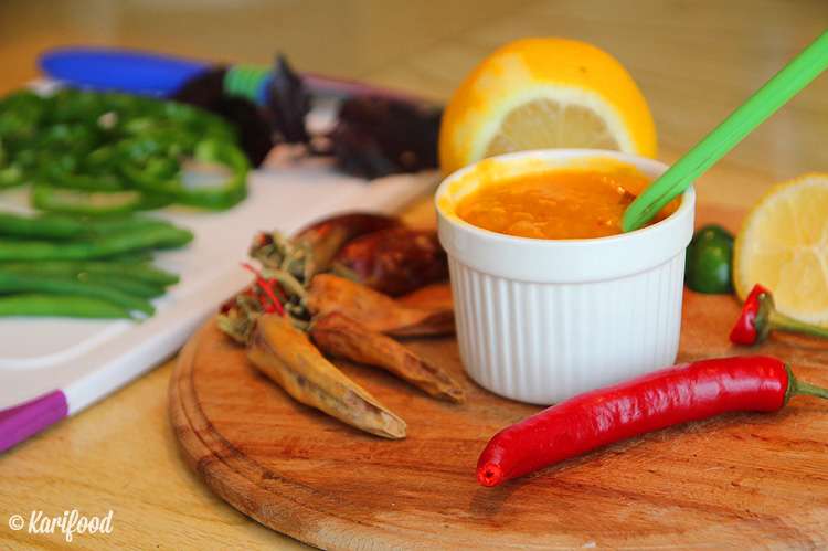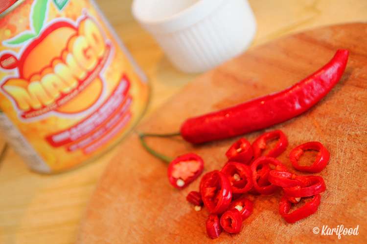 Для соуса потребуется: стручок красного перца чили, 1 чайная ложка молотого красного перца, 1 чайная ложка лимонного сока и стружка лимонной цедры, 5 столовых ложек пюре Альфонсо-манго.