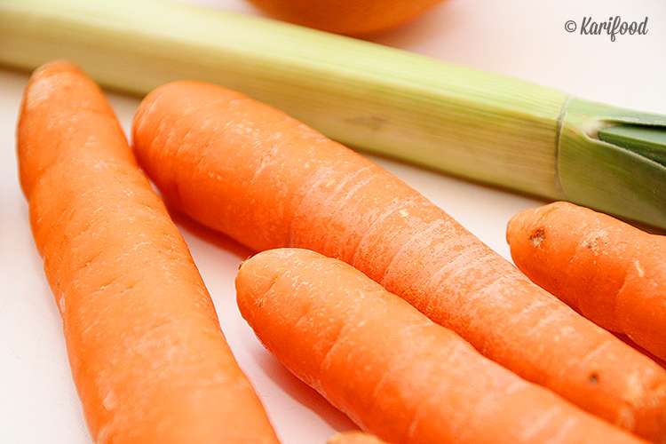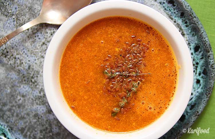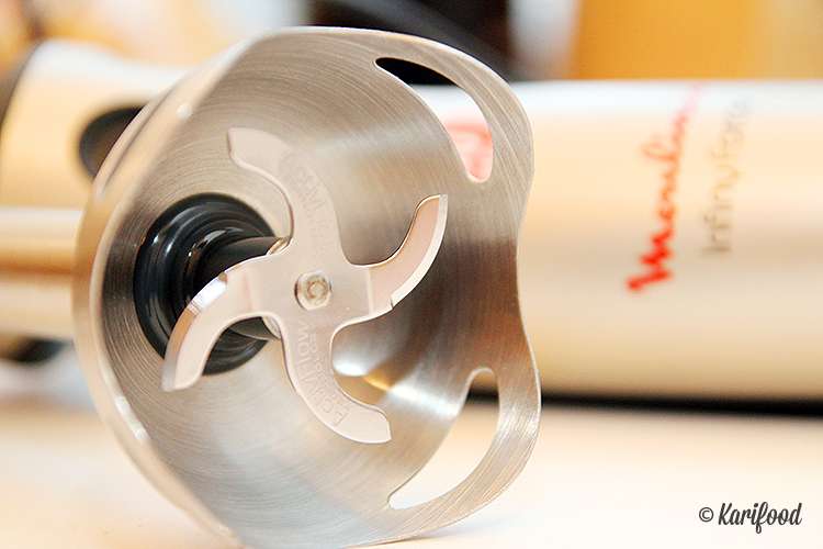 С этого супа Karifood приступил к тестированию кухонной новинки – 20-скоростного блендера Moulinex InfinyForce с четырьмя ротационными ножами. В принципе, скорость взбивания для приготовления супа-пюре — параметр не первой важности, но количество ножей и скорость превращения овощного супа в пюре произвела эффект «Вау!» «Помол» овощей очень мелкий, суп взбивается очень быстро и даже крупные толстые кусочки овощей смалываются в считанные секунды. Никакого дополнительного перетирания или фильтрования через мелкое сито не требуется. Ещё понравилось то, что блендер можно использовать сразу после того, как суп был выключен и снят с плиты. Главное, не погружать «ногу» в горячий суп больше, чем наполовину. Не очень понравилось то, что металлическая «нога» очень сильного нагревается от горячего, поэтому чтобы снять насадку – а она вся металлическая, нужно дождаться, пока она остынет.