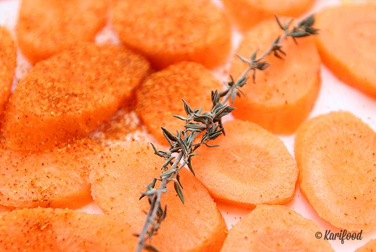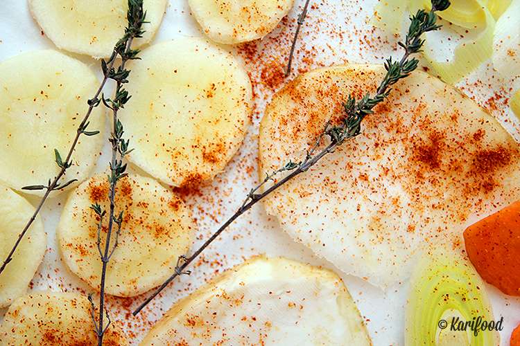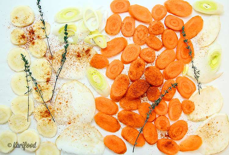Вымыть корнеплоды и обсушить на бумажном полотенце. Почистить морковь, корень петрушки и сельдерей, нарезать кольцами вместе с белой частью лука-порея. Примерно ¼ часть нарезанных корешков выложить на пергамент для выпекания, посыпать перцем, проложить веточками тимьяна для аромата и отправить в разогретую духовку на 10-12 минут при температуре 180 градусов.