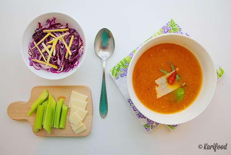 Украсьте суп зелеными листьями сельдерея или эстрагоном и стружкой сыра. Подавать можно с салатом из лиловой капусты и свежего имбиря. А грессини замените зелеными стеблями сельдерея — оставьте победу за витаминами.