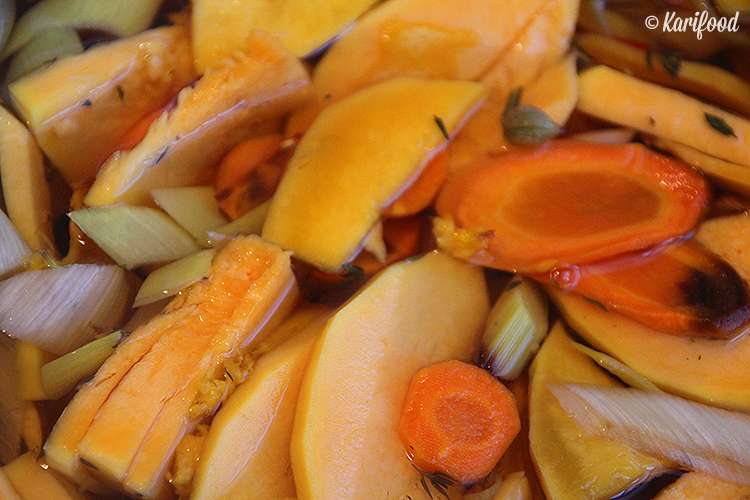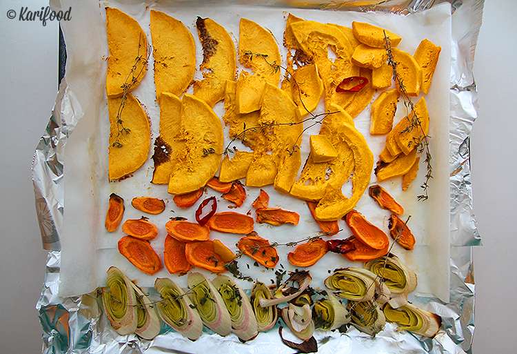 Итак, почистите морковь и тыкву. Тщательно промойте лук-порей, отрежьте зеленую часть, оставьте только белую. Тонкими ломтиками нарежьте половинку тыквы, 2 моркови, колечками нарежьте лук – 2-3 колечка уберите пока в сторону! — и выложите на застеленный пергаментом противень. Сверху добавьте несколько колечек стручкового перца, пару веточек тимьяна и стружку апельсиновой цедры для аромата. На 20 минут отправьте противень в духовку, разогретую до 180 градусов.