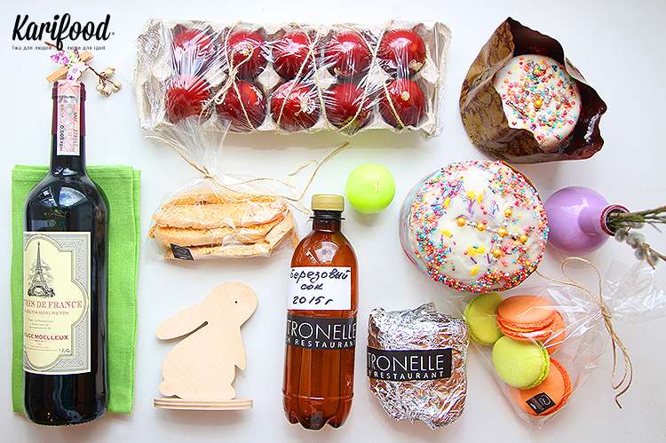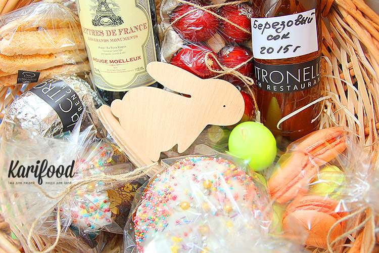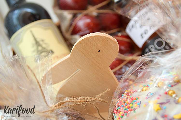 Милые сувениры в виде свечки, деревянного зайца, да и самой корзины — приятное дополнение к вкусному содержимому. Мои персональные фавориты корзинки — творожная паска «как в детстве», сочная буженина и разноцветные радости в виде пирожных макаронс.