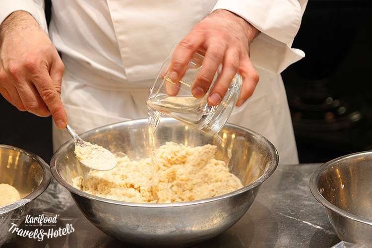 Натрите мускатный орех на тёрке. На мелкой тёрке натрите пармезан. Смешайте все ингредиенты для теста, добавляя воду маленькими порциями, чтобы тесто оставалось достаточно твёрдым и крепким.