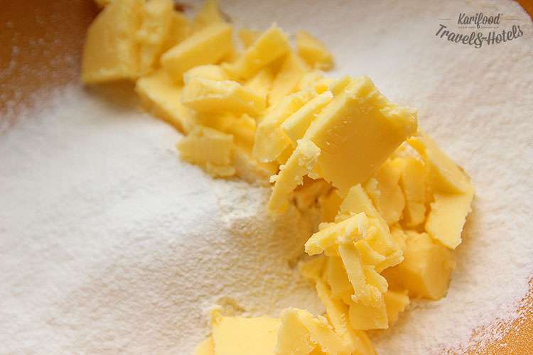 Охлаждённое сливочное масло мелко порубите. Просейте муку в глубокую миску, добавьте масло и вымесите руками до состояния мелкой крошки. Желток разотрите с сахаром добела, добавьте к масляной крошке, вымесите тесто ещё раз. Скатайте из теста гладкий шар, оберните в плёнку и оставьте в холодильнике на 1 час.