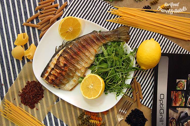 Хрустящей корочки в Tefal OptiGrill у рыбы не получится, как, скажем, у форели, запечённой на углях или обжаренной до звенящего хруста в масле на сковороде. Зато это будет полноценный healthy food — печёная рыба с румяной кожицей. Кстати, румянец можно усилить, если перед запеканием рыбу немного смазать оливковым маслом.