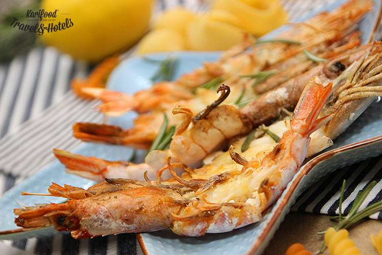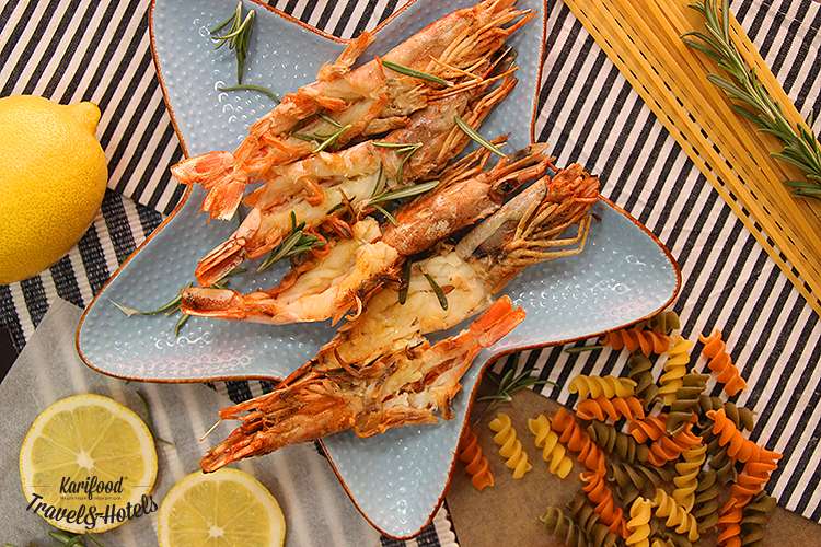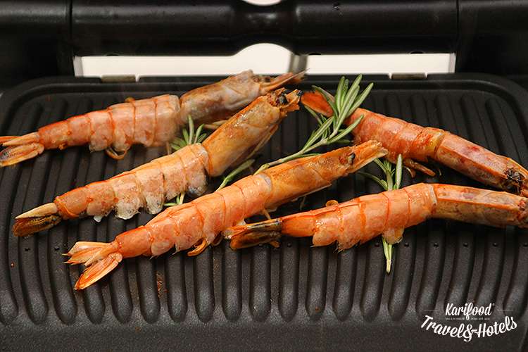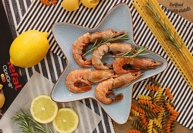 Я кладу креветки на гриль брюшком книзу, потому что мне так вкусней, и прокладываю решётку свежим розмарином. Tefal рекомендует жарить большие креветки до состояния medium. Готовые креветки можно полить лимонным соком и добавить пару капель оливкового масла.