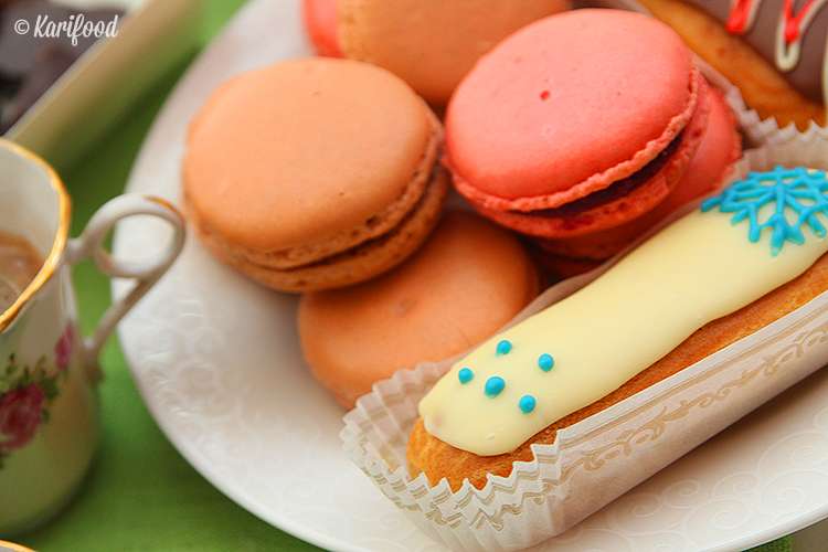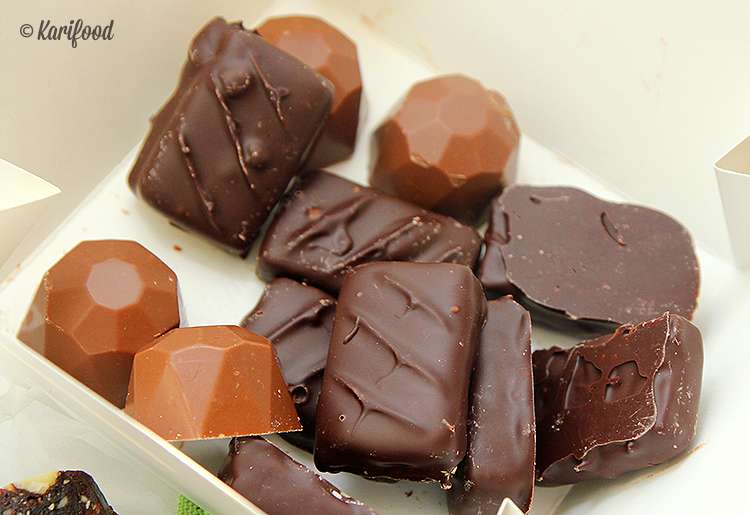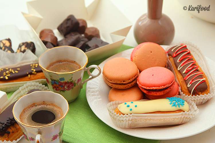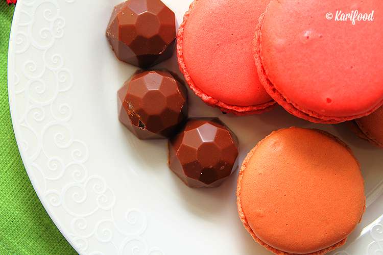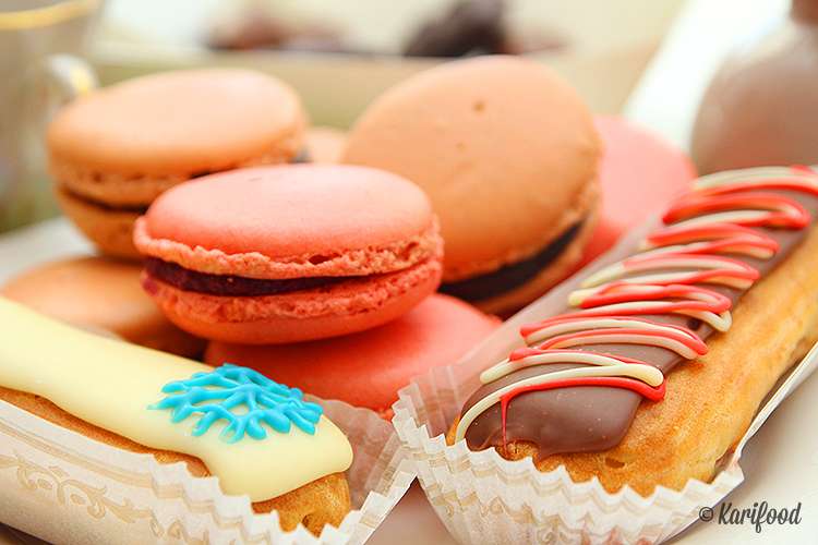 Итак, сокровища из коробки: 4 эклера, 7 макарон (3 фруктовых и 4 с шоколадным ганашем), кусочек итальянского Рождества в лице тяжелого, влажного панфорте с орехами (5 небольших порций) и коробочка шоколадных конфет (12 шт) – Karifood дегустировал похожие на драгоценные камушки с фруктовой начинкой в молочном шоколаде и с нежным пралине в черном.