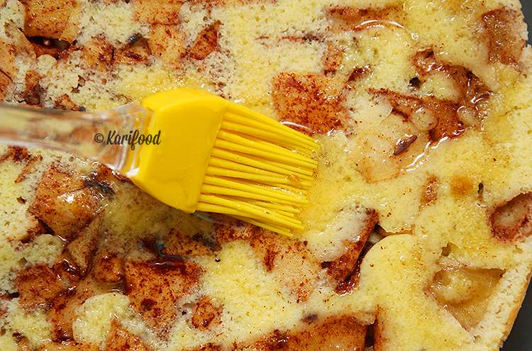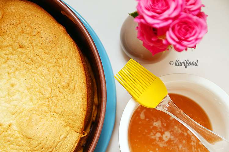 Сахар должен растаять полностью, а готовый сироп остыть до комнатной температуры. Бисквит можно смазать сиропом сверху, оставив яблоки внизу, можно перевернуть бисквит яблоками кверху, аккуратно помогая острым ножом отделить нижнюю часть от формы для выпечки (если форма разъемная). Тогда пористая часть теста с яблоками лучше впитает сироп. Кондитерской кистью аккуратно смажьте сиропом бисквит сверху и по бокам, дайте настояться и пропитаться сиропом 1-2 часа.