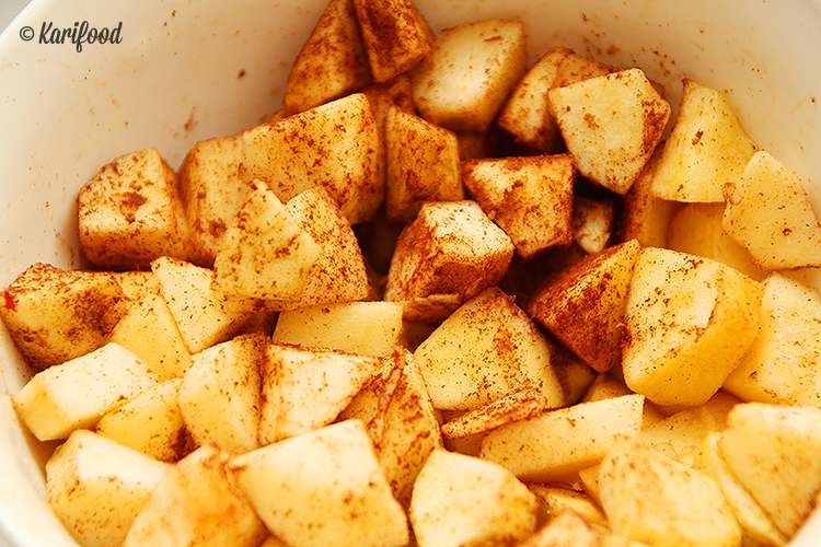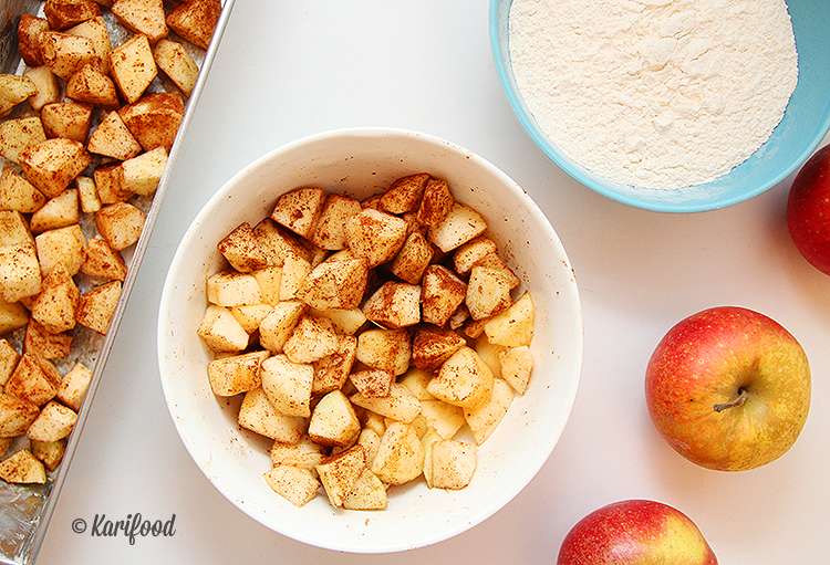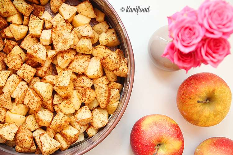 Вымойте и высушите яблоки, очистите от кожуры и семечек, мелко порежьте, посыпьте корицей и мускатным орехом. Смажьте сливочным маслом форму для выпечки и выложите на дно яблоки, равномерно распределив их.