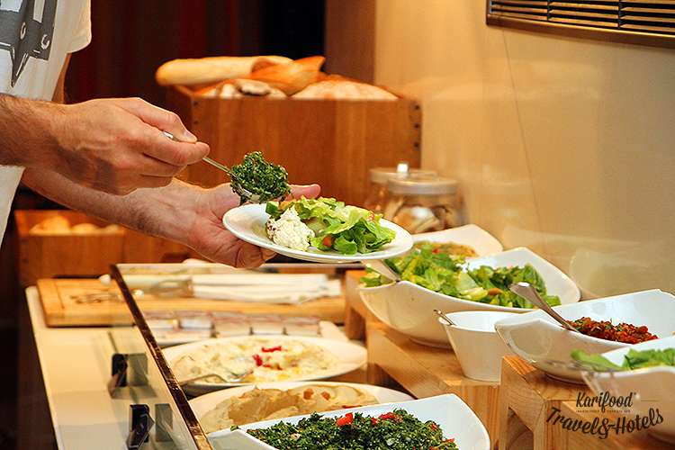 Салат-бар здесь тоже щедр и разнообразен — начиная от фатуша и табуле и до хрустящих салатов с рукколой, пармезаном, клубникой, кальмарами в облаках свежей темной зелени и хумусов.