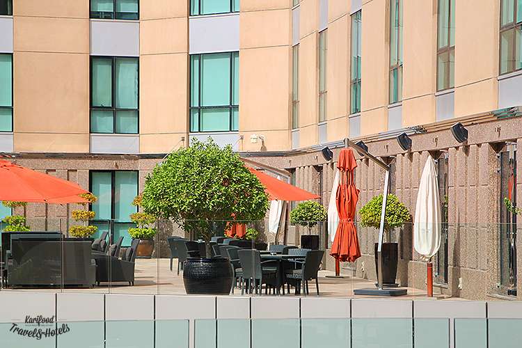 Radisson Blu Hotel Dubai Media City — один из тех отелей-кластеров, где есть под рукой всё и даже больше: две террасы с бассейнами, несколько ресторанов и баров, буфет для завтраков и обедов, бизнес-лаунж, где к обеду и к ужину сервируют уголок с безлимитными закусками и безграничным доступом к бару с напитками, включая вино, виски, пиво.
