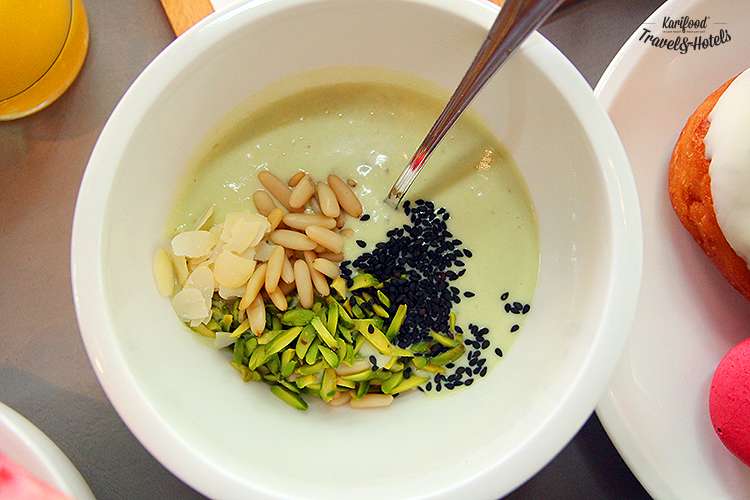 Не говоря уже об изобилии орехов, семечек, свежей зелени, сыров, ну, и чего уж там — выпечки с макаронс, пончиками и пахлавой.