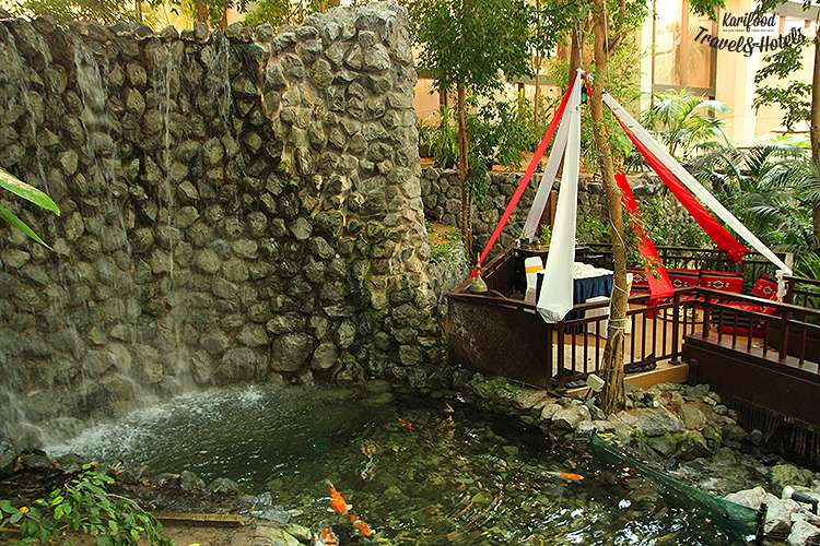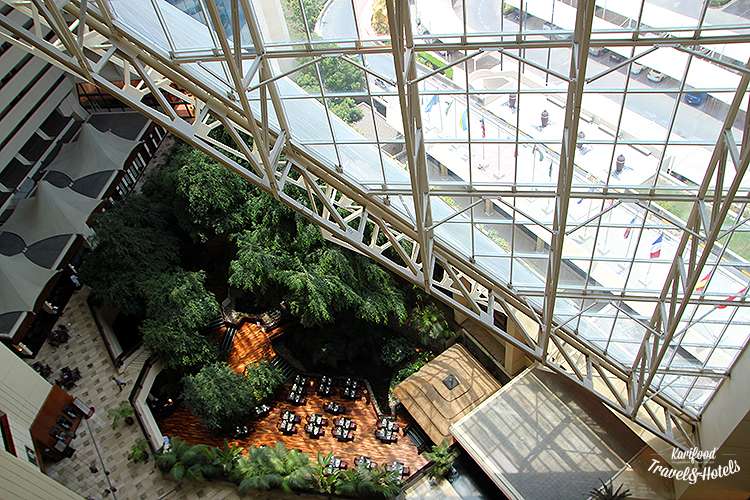 Лобби отеля под стеклянным куполом — настоящий парк, с прудом, рыбками, пальмами, фонтаном, под умиротворяющее журчание которого я однажды даже чуть не уснула прямо за обеденным столом!