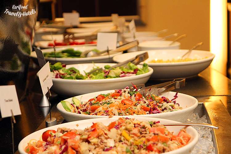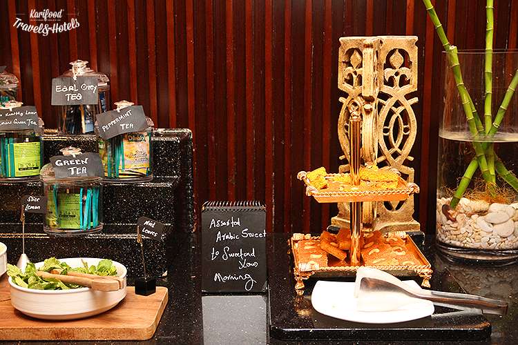 Фрукты, пахлава, арабские сладости (горячие пудинги с финиками, орехами, шафраном под густыми сладкими соусами из ванили и шоколада!), мой любимый корнер с традиционными арабскими закусками — лепёшками, затаром, муаммарой, салатом фаттуш, хумусом и мутабалем, огромный выбор салатов, свежих овощей, станция, за которой повара трижды в день готовят specialities — пасту, фритаты, гриль.