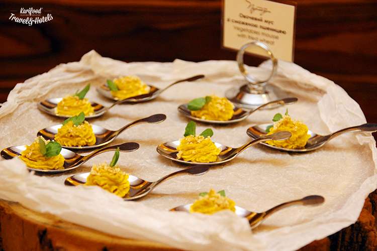 Салати в порційних келишках, дуже смачна випічка на тацях (вертута з грибами — космос!), спеціальні сервірувальні ложки для смачних овочевих мусів — люблю, коли смачно й красиво.