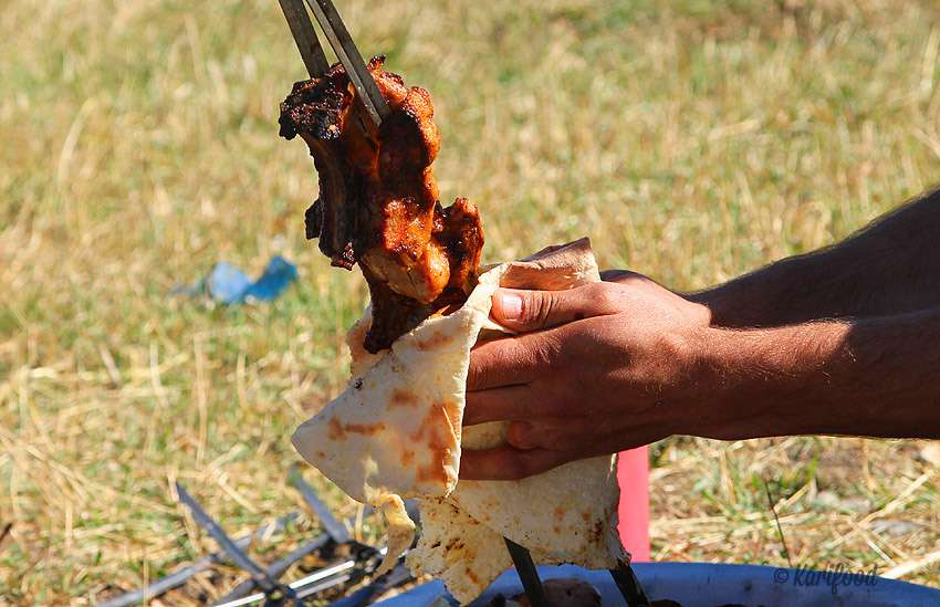 Лавашом, а не ножом или вилкой, снимают с шампуров горячий шашлык — жир с ароматного мяса, только что снятого с костра, впитывается в лаваш, и уже не знаешь, что вкуснее — само мясо или лепешка, которой его сняли.