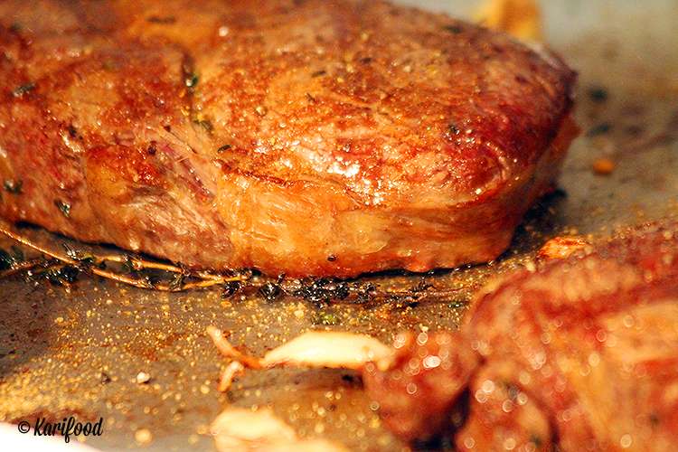 — Чтобы максимально сохранить мясной сок при жарке, быстро обжарьте стейк с обеих сторон на температуре гриля в 270-300 градусов, по минуте на каждую сторону; доготавливайте стейк в духовке, ежеминутно переворачивая его (в ресторанах для этого используется специальный гриль или конвектомат);