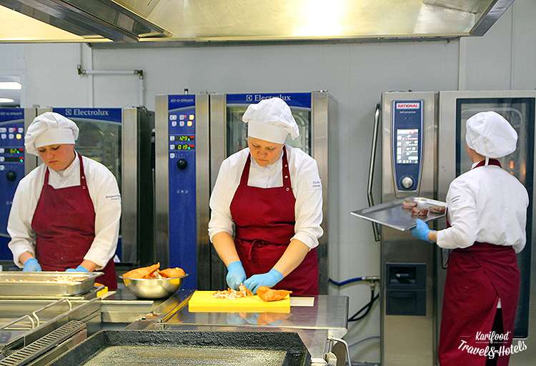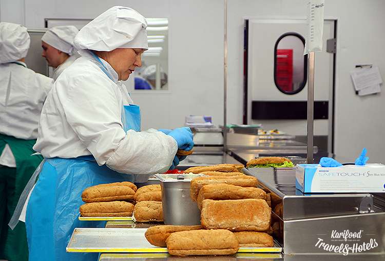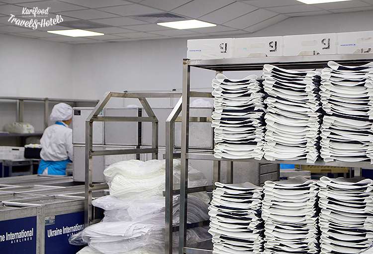 Кухня Sky Food Services рассчитана на подготовку 8 000 порций в день, здесь «собирают» обеды, завтраки, закуски для пассажиров премиум, бизнес и эконом класса, а также для капитанов и остальной команды.