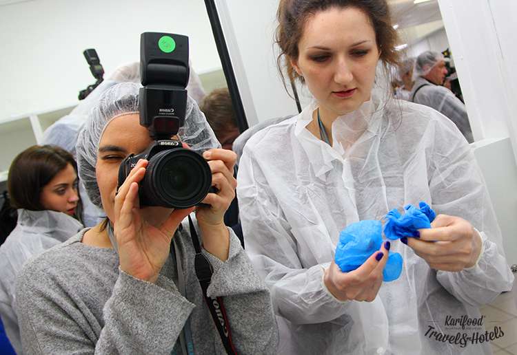 Продукты поступают на склад, а оттуда в поварской цех. Чтобы попасть в этот цех, к примеру, журналисту нужно — помимо всех разрешений и заполненного санитарного листа — обуть бахилы, халат, волосы спрятать под шапочкой, а руки продезинфицировать, по меньшей мере, дважды.