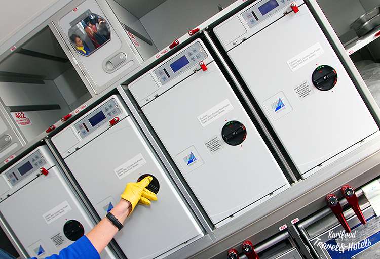 В голове самолета тоже есть небольшая кухня с авиационными духовыми шкафами — тут греют еду для команды и пассажиров первого класса.