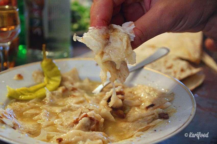 — едят хаш так: в тарелку с бульоном крошат сухой лаваш, пока тот не размокнет, обязательно добавляют чесночную заправку, и свежим лавашем прямо рукой собирают хаш из тарелки и едят. Никаких ложек. Хотя, если вы едите хаш впервые, и все, кто сидел с вами рядом за столом, уже давно подчистили свои тарелки и ушли в сад пить кофе, то, конечно, можете попросить у хозяйки ложку;