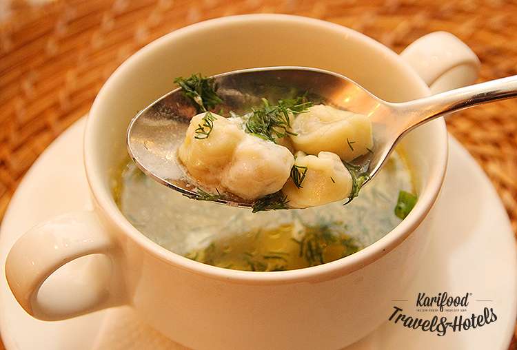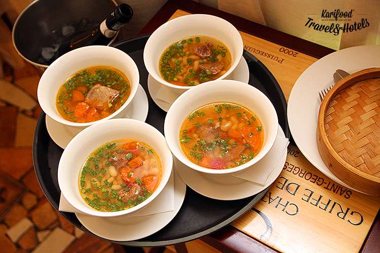 Ещё одна характерная особенность традиционных татарских супов — прозрачный бульон, который варится отдельно от остальных ингредиентов. И только в тарелке бульон соединяют с овощами, мясом, пельмешками, что даёт максимально прозрачные и сильные ароматы: мясо пахнет мясом, а не отварной фасолью, фасоль сохраняет собственный вкус, не растворяясь в многоголосии овощей и зелени.