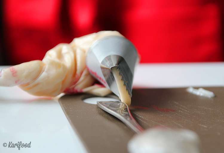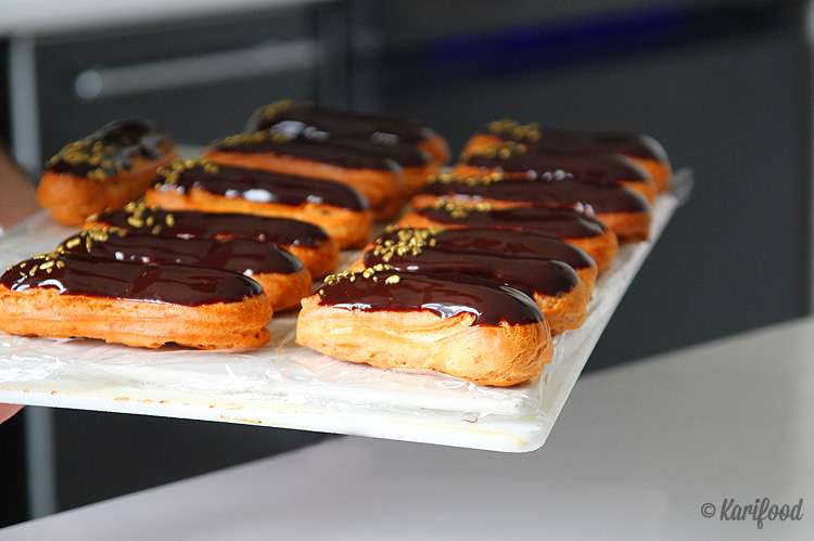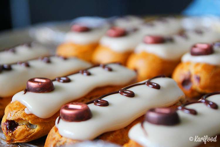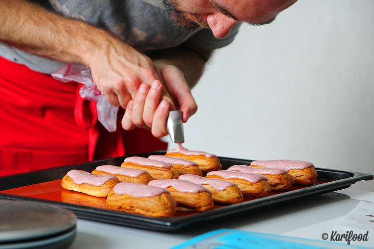 Глазурь становится нежно розовой с крохотными частичками свекольного помола. Эклеры начинены вишневым кремом, который больше, чем наполовину, состоит из настоящих вишен.