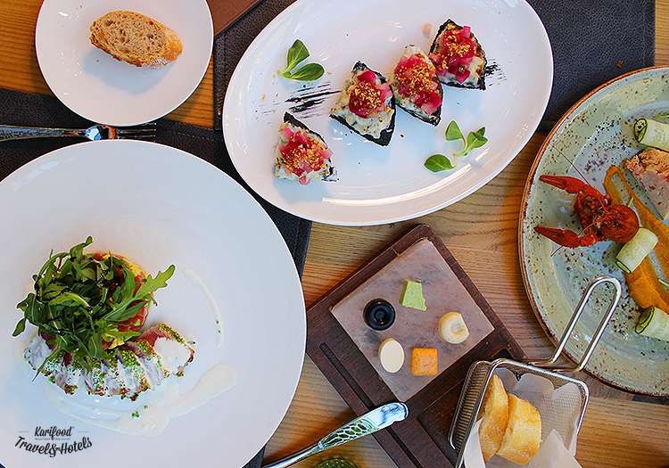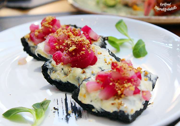 Одна из моих любимых закусок в Black Market Restaurant — наборы тостов, ингредиенты которых могут варьироваться по сезону, но суть та же: чёрную булку разрезают вдоль, затем делят на четыре мини-тоста и дальше уже дополняют ростбифом, тунцом, щучьей икрой, горгонзоллой, авокадо, осьминогами и всем, что Бог пошлёт!