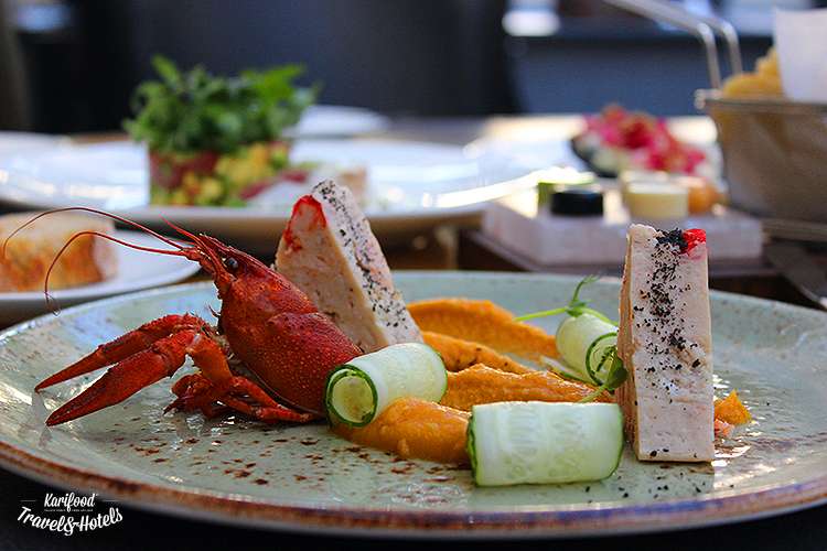 Террин из раковых шеек с томатным пюре и тонкими завитушками хрустящего огурца внушает уважение размером порции. Смело можно заказывать на двоих.