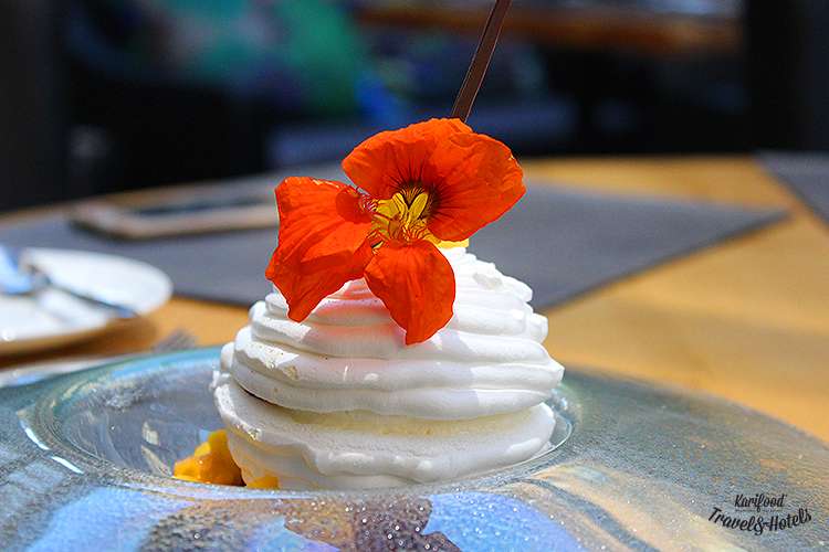 Десерт — моя любимая часть обеда и ужина, и как жаль, что не в европейской традиции начинать приём пищи со сладкого. Очень жаль! Итак, signature-десерт в ресторане Black Market — меренга Павлова. Её подают в виде шара, начинённого заварным кремом с манго, с ломтиками манго и соусом из красных ягод, а сейчас ещё и украшают шоколадной палочкой и цветами настурции. Цветы — очень даже съедобные. Конечно, за воздушным сладким облаком из сахара и белков уже не ощутить тонкого, чуть кисловатого вкуса лепестков, но, по крайней мере, знайте, цветы в десерте можно есть. Эта Павлова — любовь, умноженная на любовь — однажды у меня хватило сил осилить две подряд.