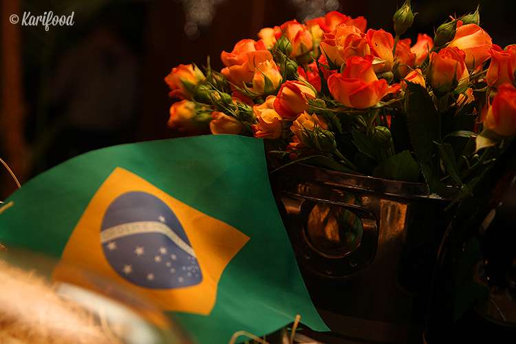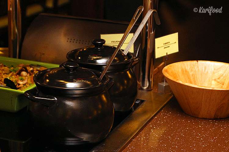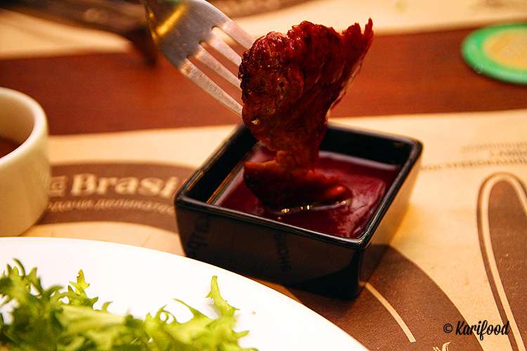 Мясо здесь готовят украинское, салат-бар заставлен свежей зеленью, сырами, артишоками, рисом, мидиями, оливками и каперсами, а в углу подогреваются горшочки с колоритной бразильской feijão, фейджоадой, густым варевом из фасоли, говяжьих ушей с рисом и фарофой, маниоковой мукой. Подход к салат-бару не ограничен в течение вечера.