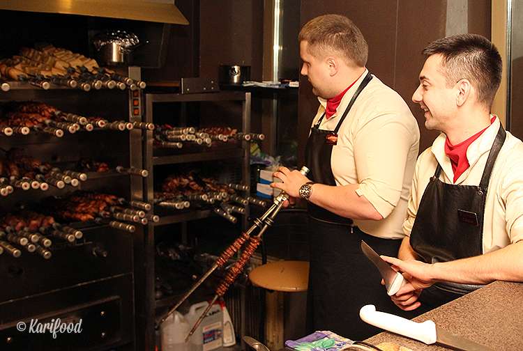 За полчаса до появления гаучо начинает работу салат-бар. Предполагается, что за эти тридцать минут гость, совершив пару набегов на салатную стойку, утолит первый голод, а то и вовсе плотно подкрепится, и уже будет с большим спокойствием реагировать на каждый вынос мяса в зал.